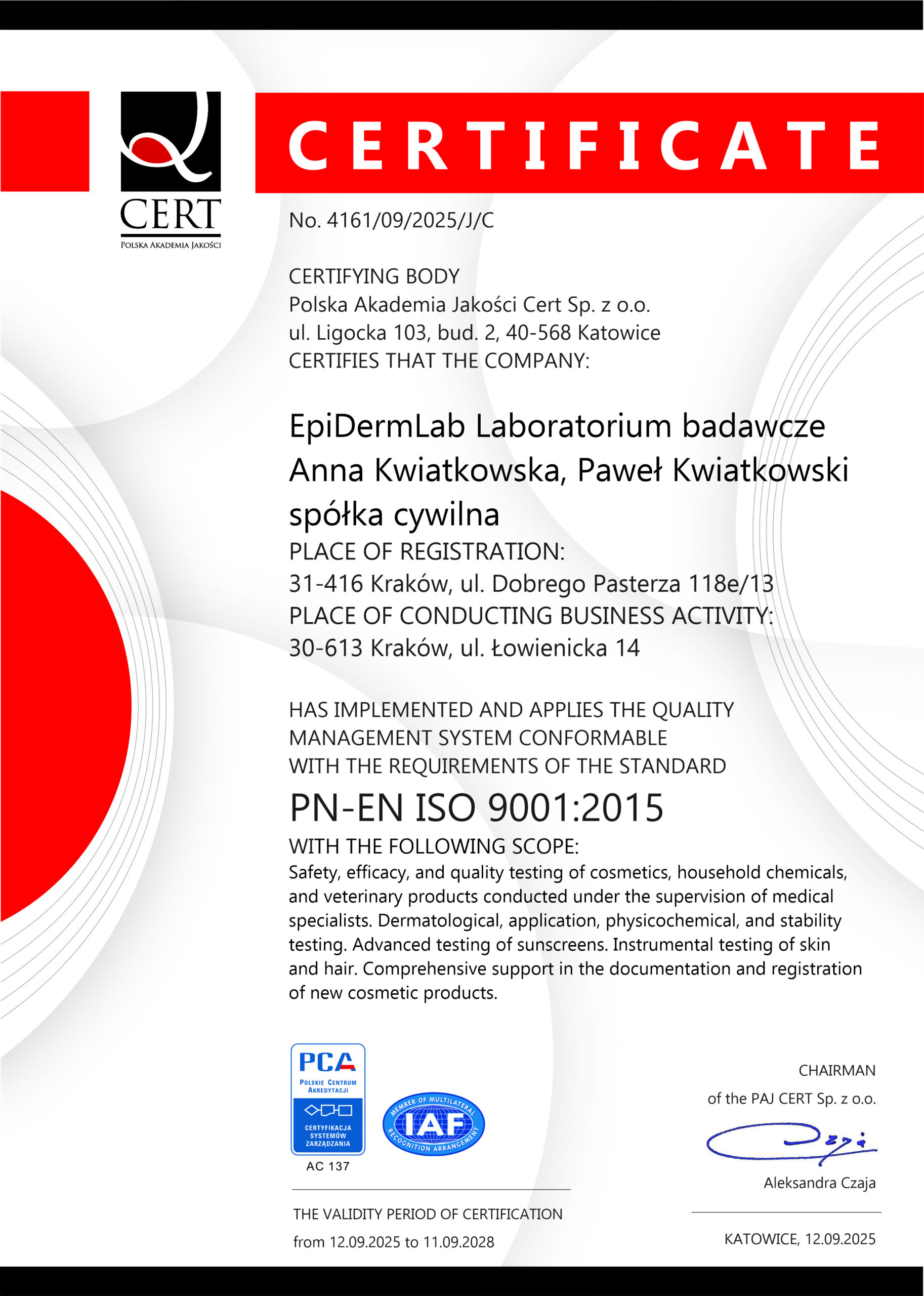 EpiDermLab Laboratorium badawcze s.c., Poland, 30-613 Kraków, Łowienicka 14/3, VAT-ID: PL9452271009, phone: +48 662 178 533, e-mail: SPF@epidermlab.pl